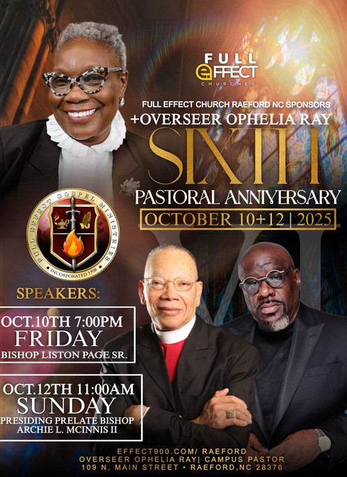 In the year 2000, Elder Ray joined the Full Effect Gospel Ministries Church under the leadership of Bishop Archie L. McInnis II. She continues to exemplify Christ wherever she goes as she continues to gain biblical knowledge through the leadership of this local assembly. She fulfilled her role as The Pastoral Care President for 6 years. Fundraising, and financial obligations to her Pastor were consistent and timely, a Youth Leader, Superintendent of Sunday School and Usher Board member. It’s no surprise that in March of 2004, she was ordained as a Minister to this local ministry. In April 2019, Bishop Archie L. McInnis II acknowledged the call of God for Elder Ophelia Ray’s life and on April 27th he ordained her as an Elder in the Lords Church. Appointing her as Campus Pastor of the Raeford, North Carolina Church. With a Bible in her hand, Elder Ray held her first service on May 5th, 2019.
